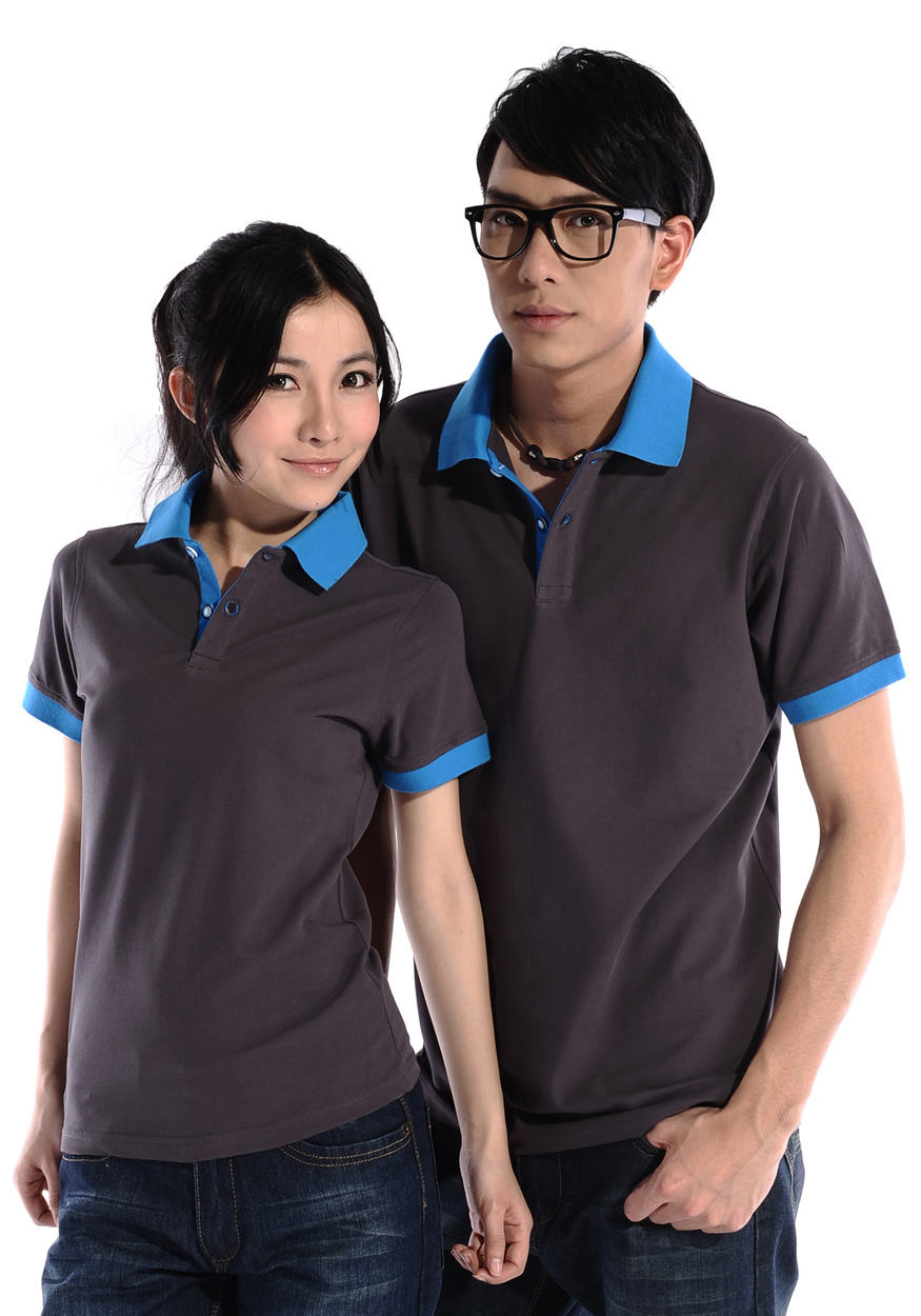 深灰色珠地棉POLO衫,領袖撞藍色,男女時尚款定制1