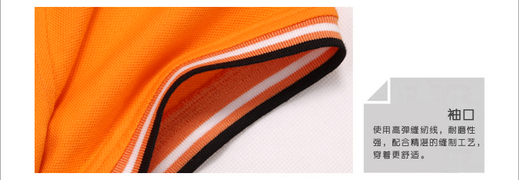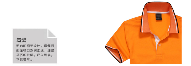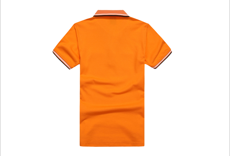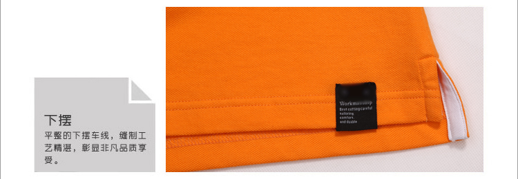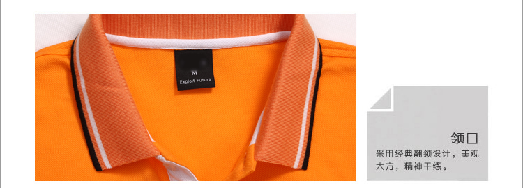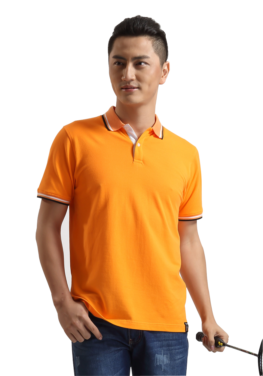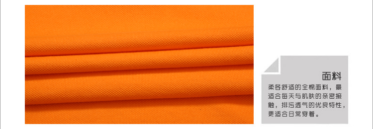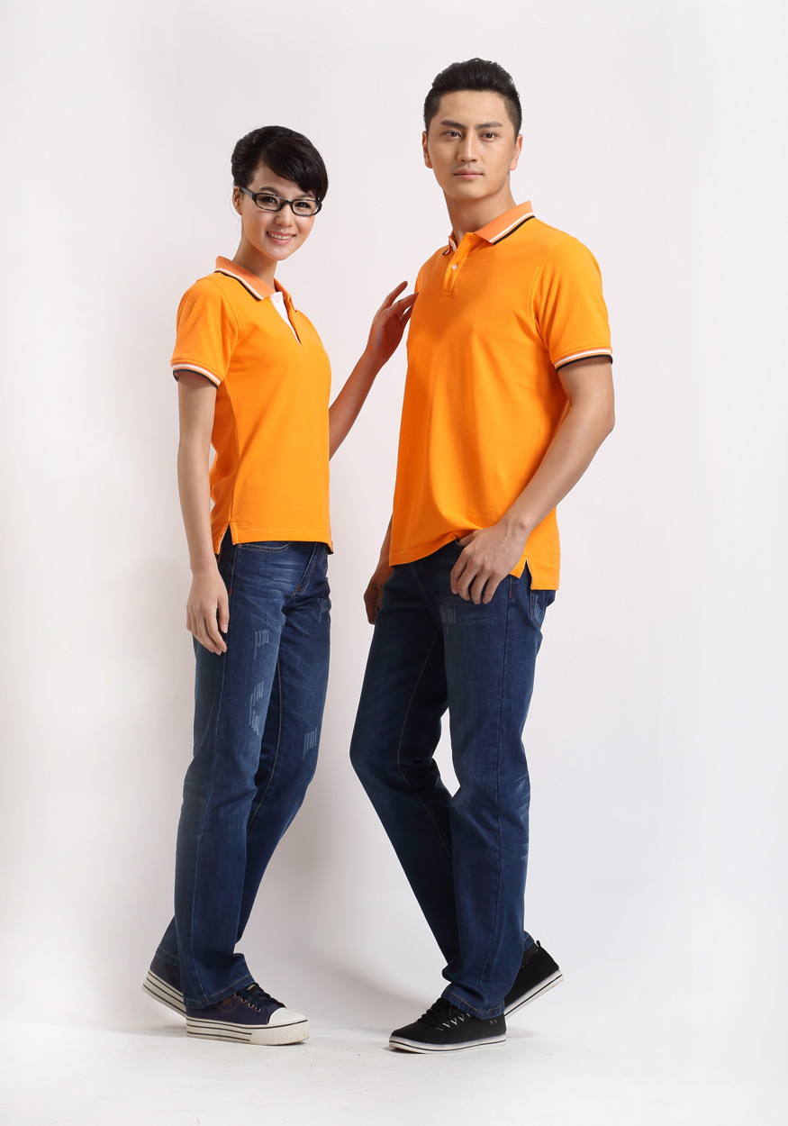 > 橙黃色珠地純棉POLO衫,領(lǐng)袖間條撞色,男女時尚款式定制