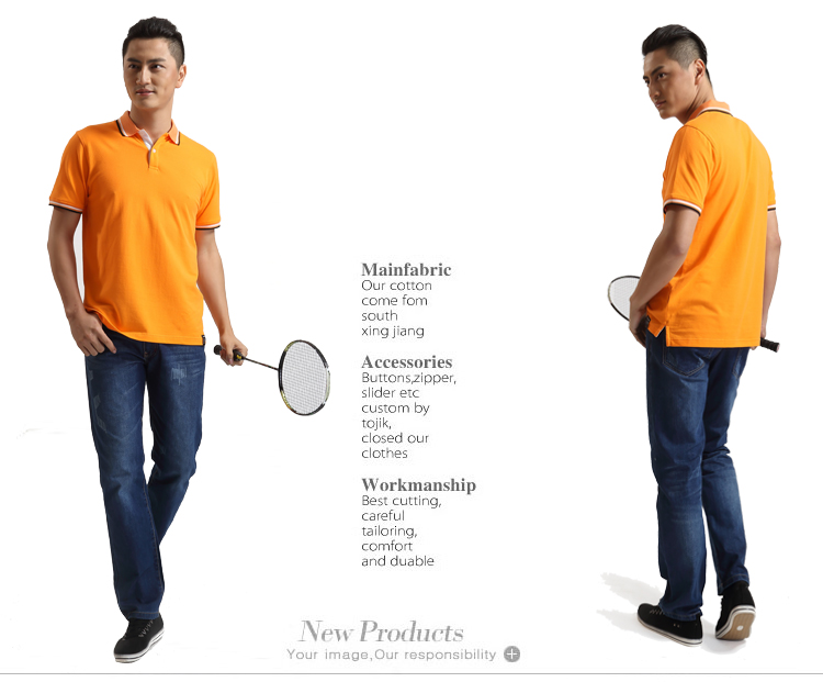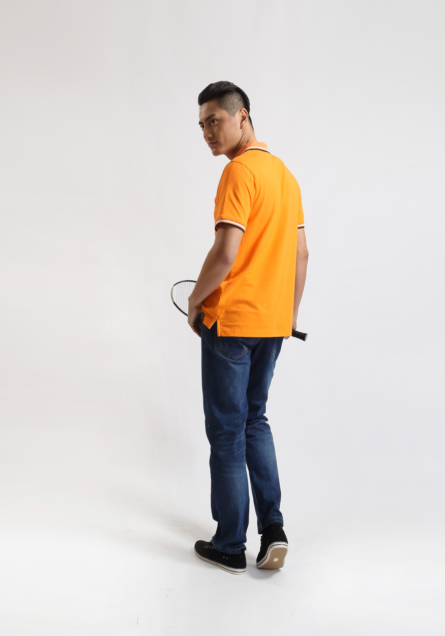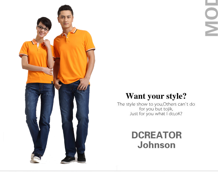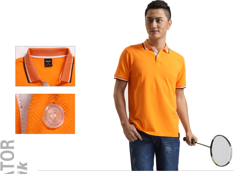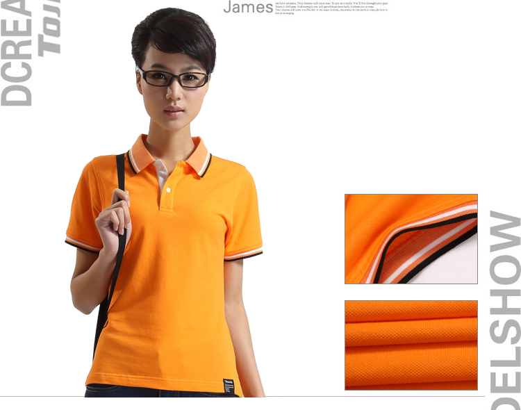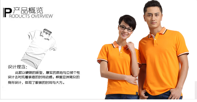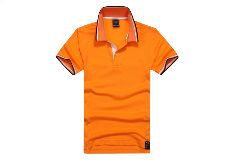 > 橙黃色珠地純棉POLO衫,領(lǐng)袖間條撞色,男女時尚款式定制