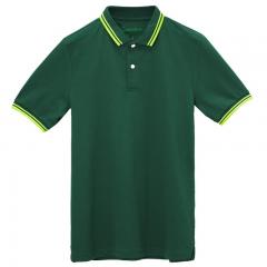 墨綠色珠地棉POLO衫款式,領(lǐng)袖間條撞色,男女時(shí)尚款定制